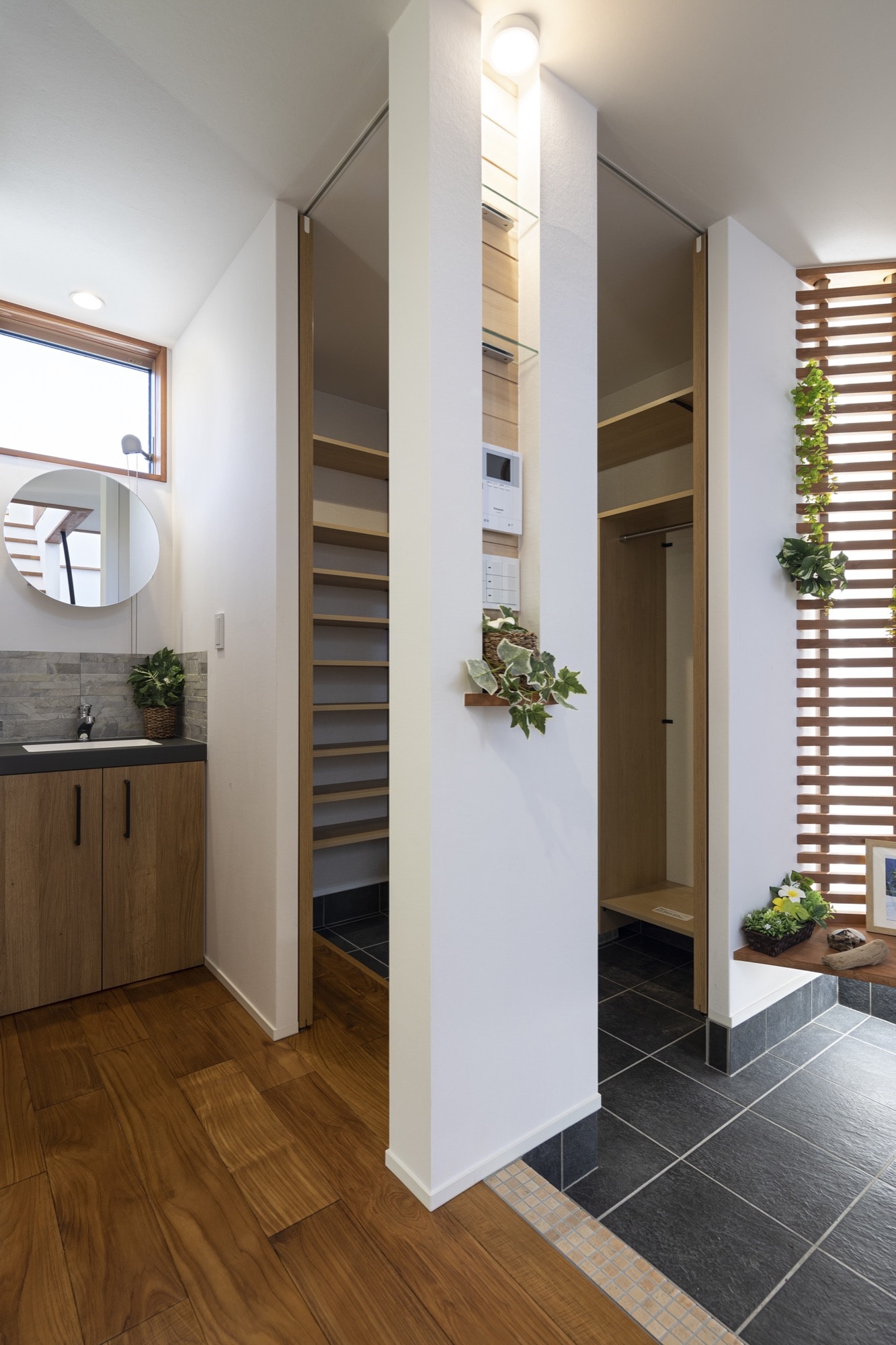 扉がないことで空間につながりが生まれ、視界が広がります。玄関全体が広く感じられ、明るく開放的な印象に。