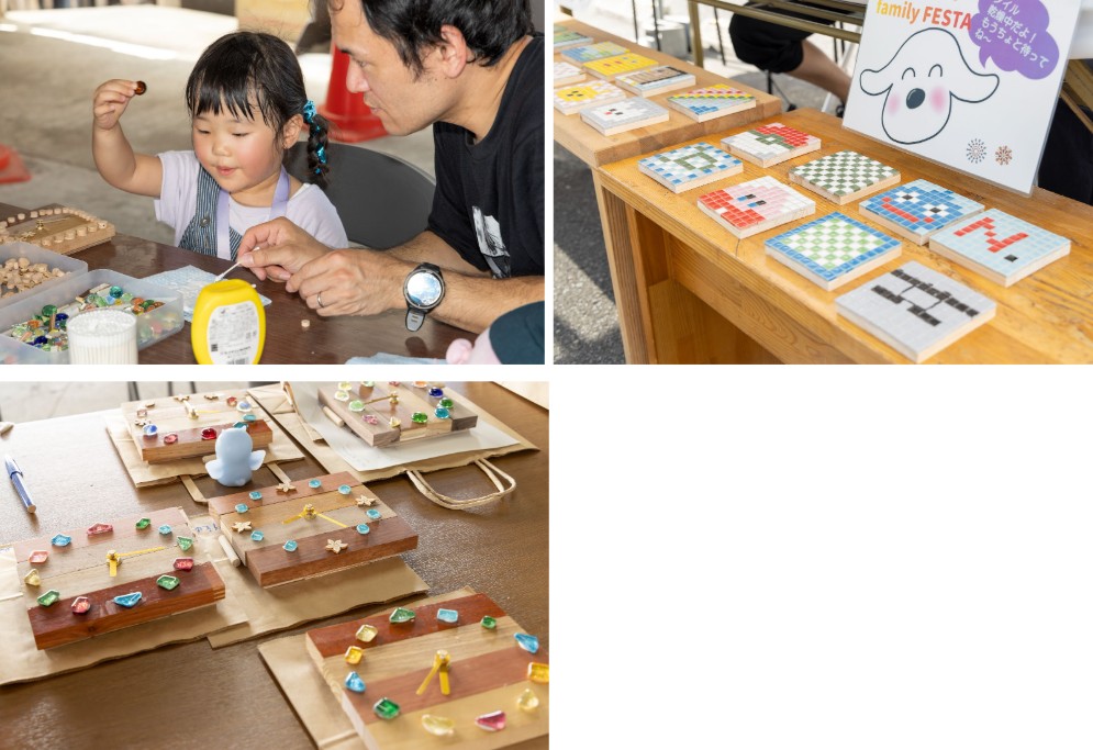 クラフト体験は、家づくりに欠かせない床材を使ったオリジナル時計づくりと、タイルアート制作のブースを出展。