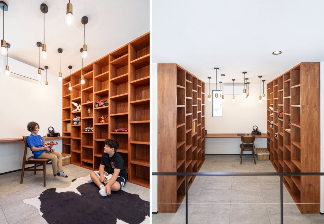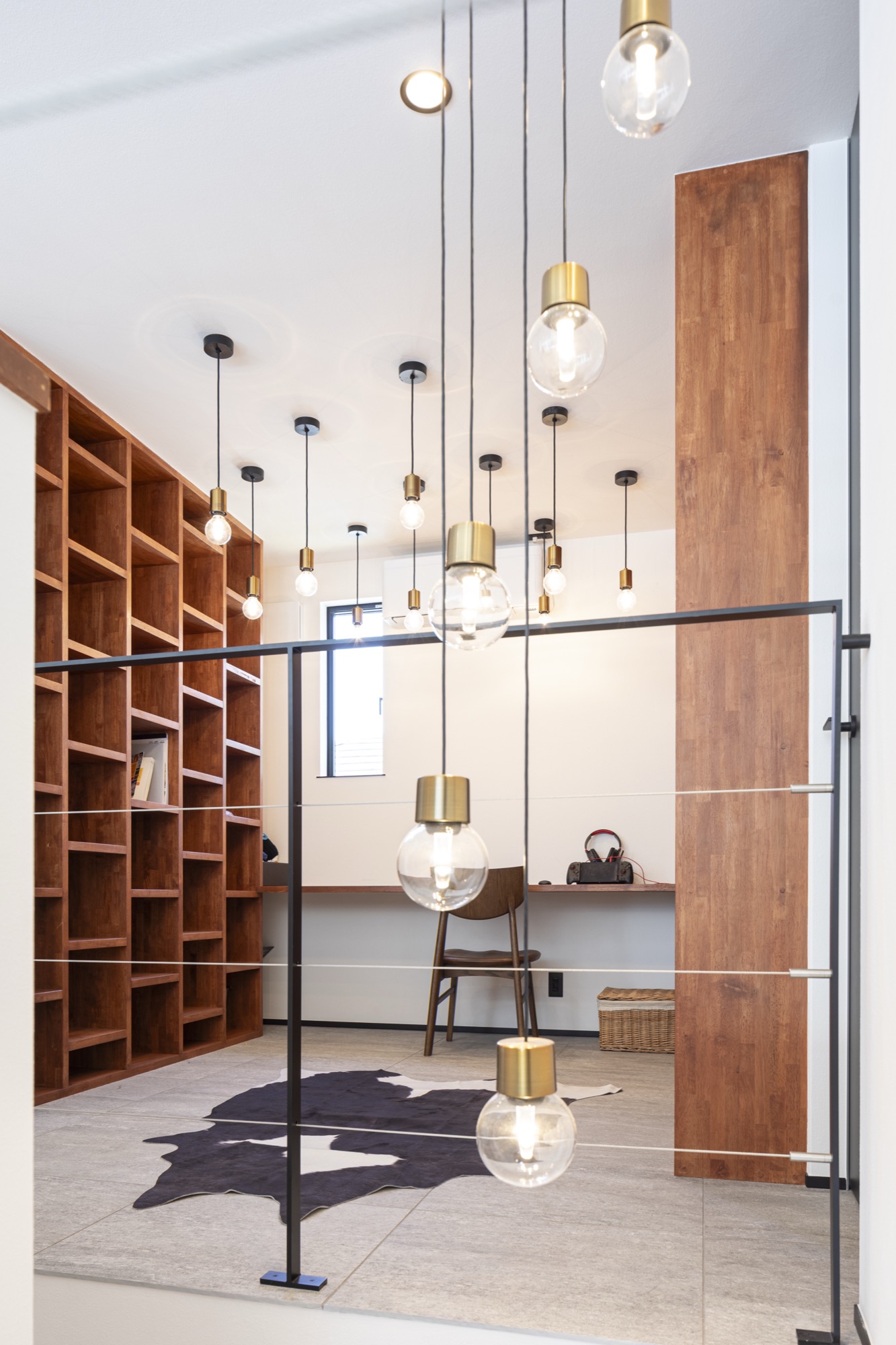 こちらの施工事例では、吹き抜け上部の2階ホールにソケットペンダントライトを多灯吊り。コードの長さをランダムにして、動きを出しています。照明器具そのものはシンプルなデザインなのに、とても華やかです。