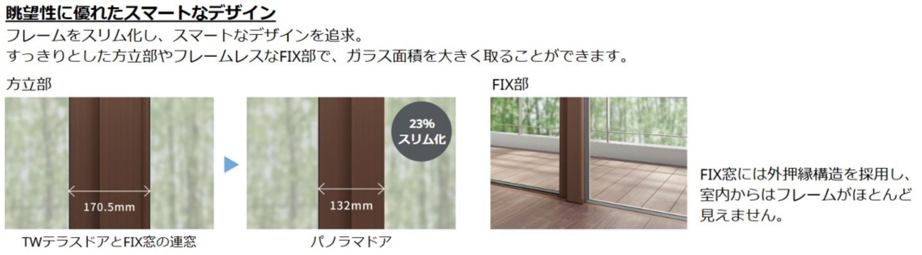 また、通常のテラスドアとFIX窓を連窓で施工する場合と比べ、枠と枠の間の柱もスリムに。遮るものがない絶景を室内に取り込むことができます。