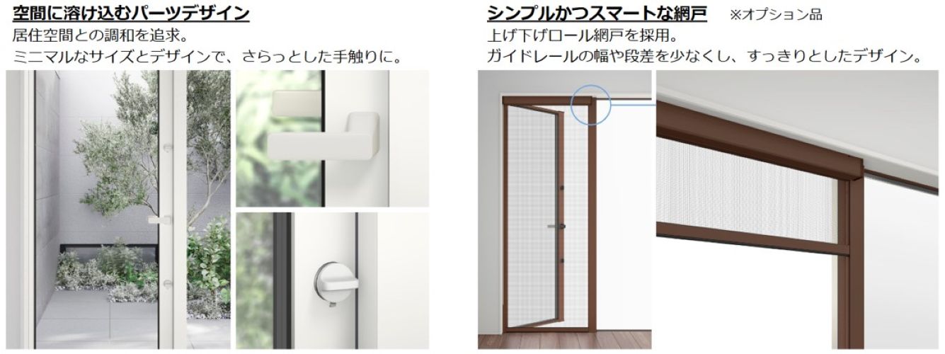 ハンドルや鍵などはミニマルなパーツデザインを採用。マットでさらっとした質感で、リビングなどの居住空間に溶け込みます。網戸もすっきりとしたデザインで、景観を邪魔しません。豊富なカラー・ラインナップで、統一感のあるコーディネートが可能です。