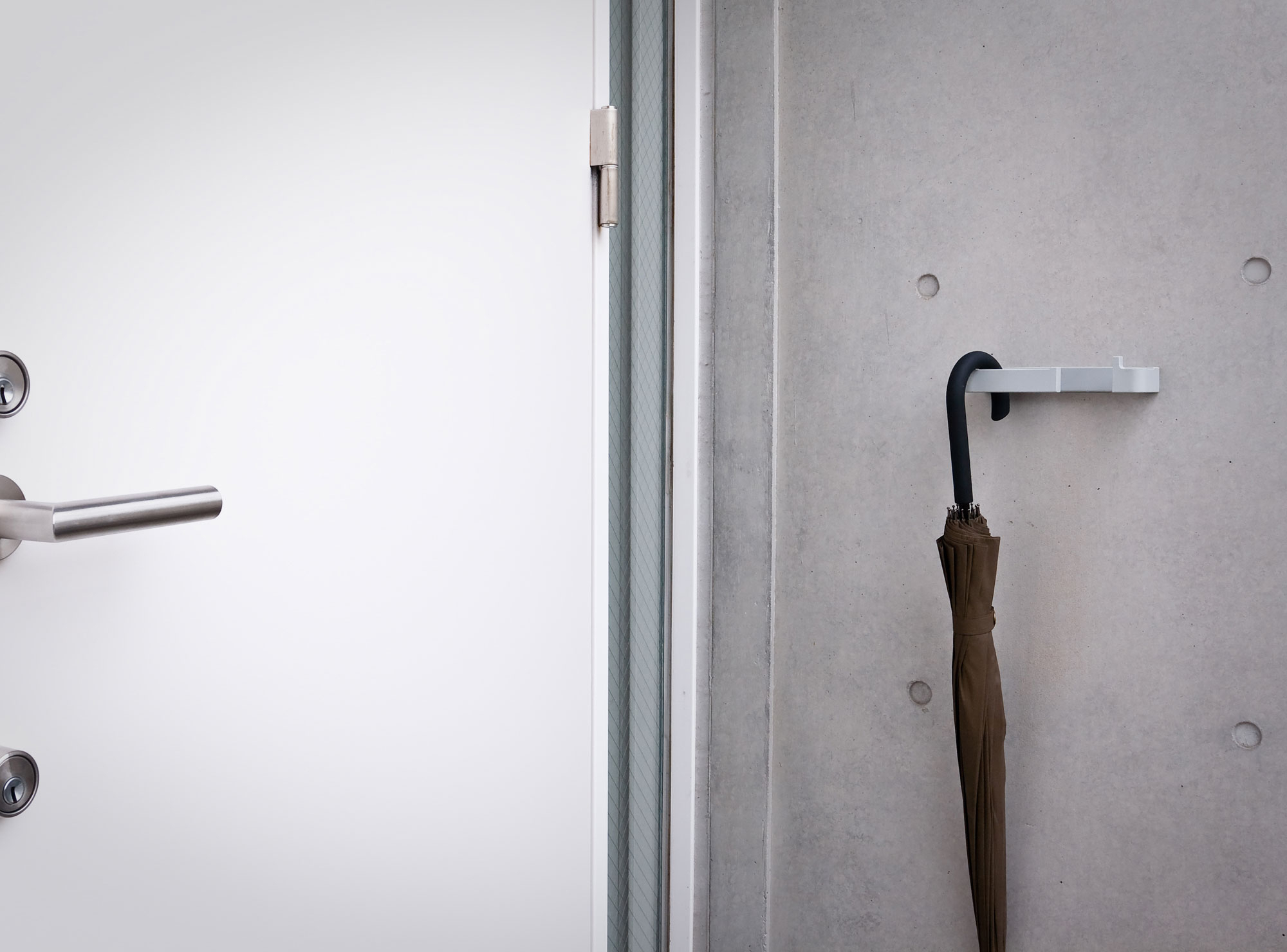 玄関ポーチの壁にマルチフックがあると、ワンちゃんのリードや買い物袋、傘などをちょっと掛けるのに便利。両手が空いた状態で鍵の開け閉めなどができ、小さなお子さまを抱っこしているときや、荷物が多いときにも重宝します。