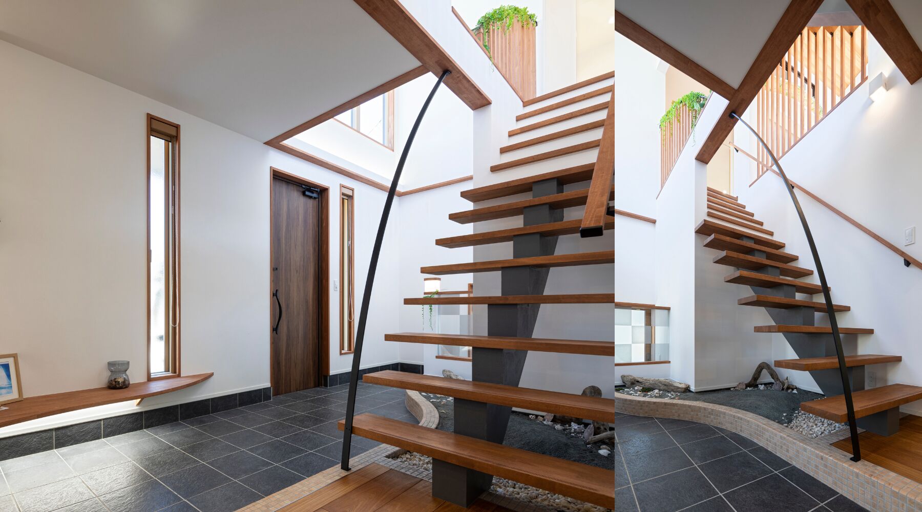 スラリと伸びる黒いストリンガーが、踏板の中央を下から支える「モノストリンガー階段(一本桁階段)」です。緩やかな弧を描く曲線のハンドレールが、構造美にやわらかさを添えるアクセントに。ストイックでミニマルな造形が、階段下の坪庭や、2階ホールの格子手すりなど、和モダンなデザインに美しくなじんでいます。