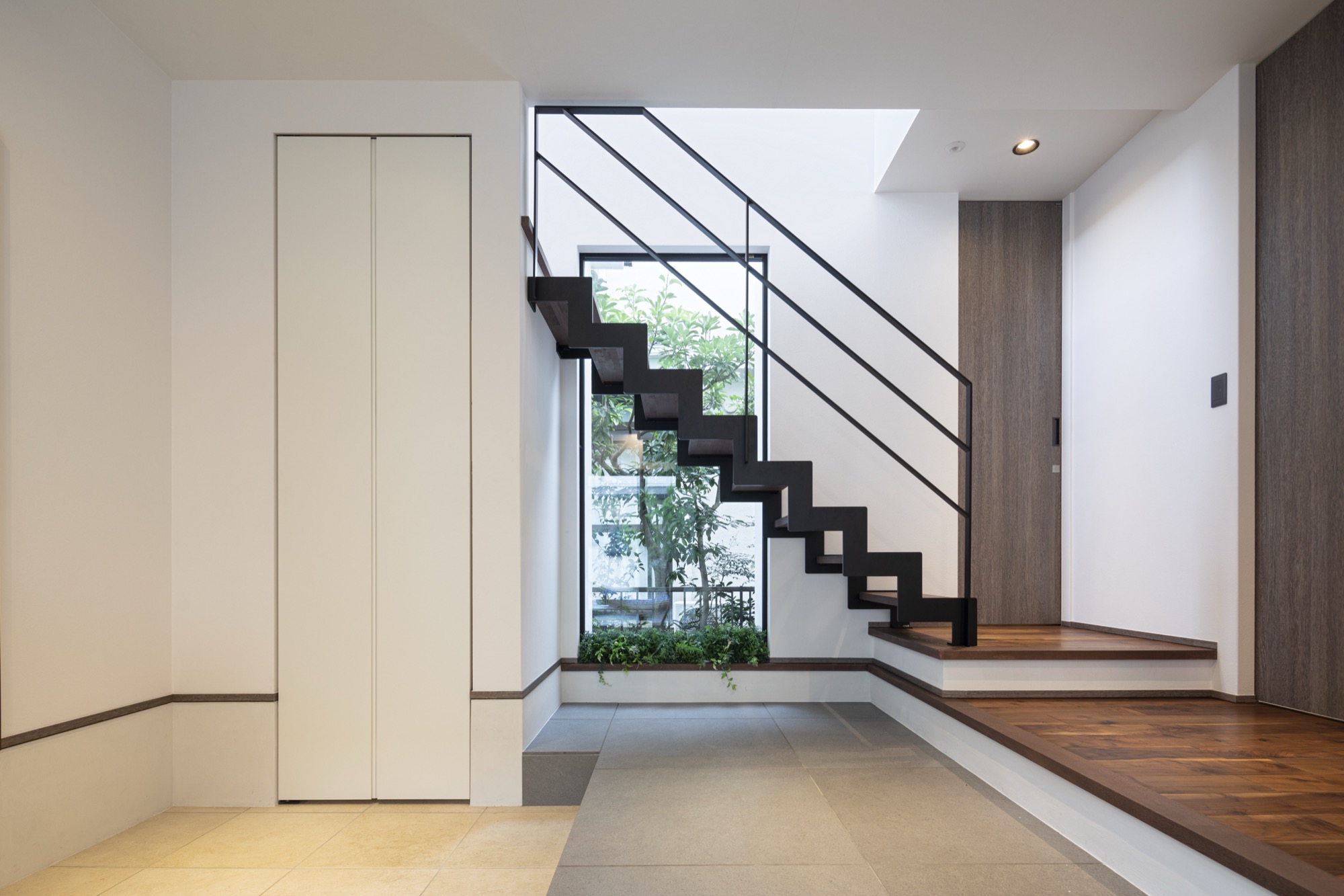 存在感のある造形越しに、ピクチャーウインドウを配置することで、立体的で奥行きのある眺めをつくり出しているのもポイント。さらに硬質な金属と、心安らぐ緑の対比で、景色にふくらみを持たせて、一見シンプルでありながら印象的なエントランスを描いています。