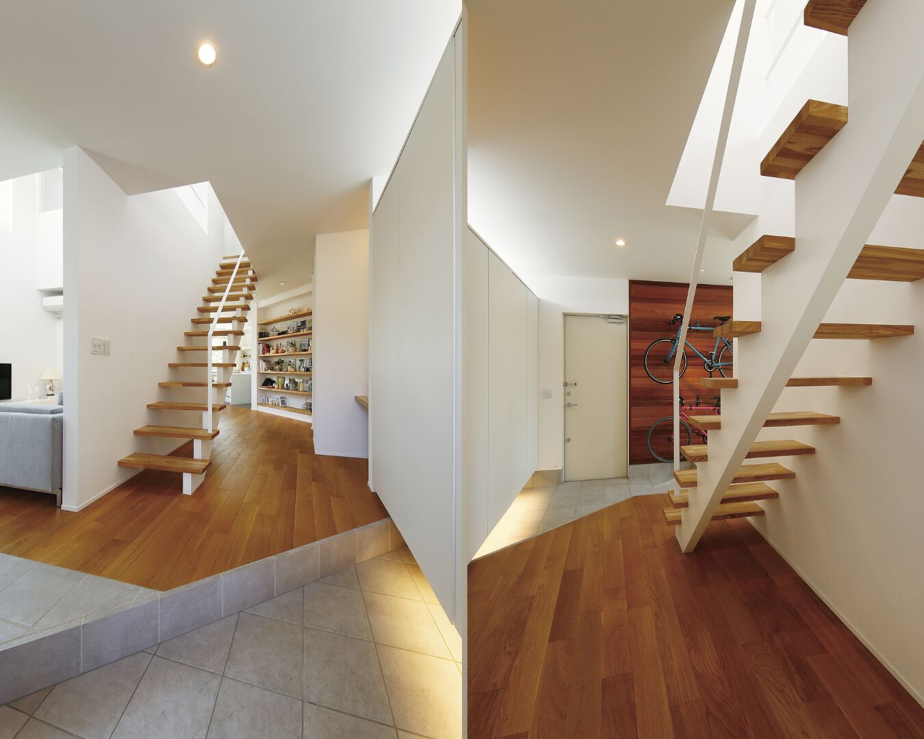 蹴込み板のないスケルトンな片持ち階段は、スマートなデザインはもとより、配置もとことん吟味。階段を下りるときは、バイクハンガーとウッドパネルを組み合わせた自転車ディスプレイ、上がるときは小物などを並べた飾り棚を眺められます。
