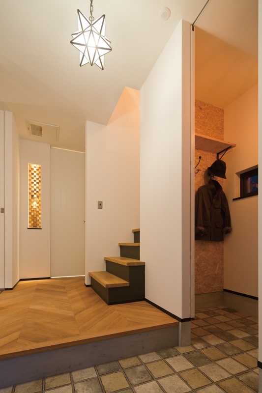 玄関フロアには無垢オークのヘリンボーンを、リビング床はオークの巾広と巾狭のミックス張り、造作の棚は古材(足場板)を利用して、素材にもしっかりこだわりました。
